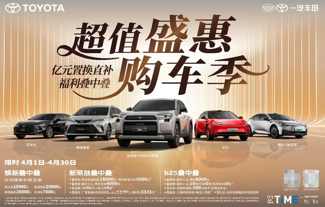 不负春日好时光,一汽丰田超值盛惠购车季同步开启,亿元置换直补福利叠加,诚意满满敬献广大用户。4月1日至4月30日,普拉多、皇冠陆放、格瑞维亚、亚洲龙车型,本品牌以旧换新可享至高20000元补贴;4月30日(含)前下订新荣放,且在2026年5月31日(含)前完成购车开票的用户,可享18000元现金权益+5000元限时燃油补贴,国补之上再叠加至高4000元置换补贴;也可选择5年0首付、前2年/3年0息的金融补贴(置换、金融二选一);同时还能享受厂家直销6年双保无忧服务补贴(原价5140元,限时价3333元)。