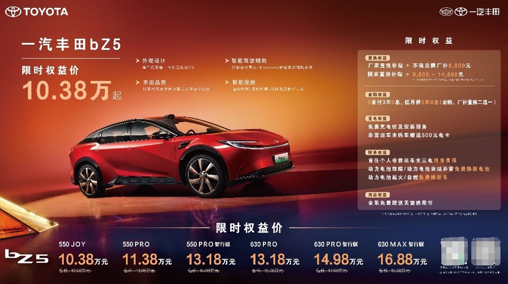 纯电车型bZ5在4月推出限时权益加码,置换权益升级为不限品牌厂补8000元,更可叠加9000-14600元的国家置换补贴,550JOY车型叠加厂补及国补后,限时权益价低至10.38万元。金融权益也是诚意满满,0首付3年0息,低月供5年0息,降低购车门槛(置换、金融二选一)。同时匹配免费充电桩、500元电卡、非营运车主三电终身质保及电池三兜底保障政策,为后续用车提供安心保障。4月购车用户还可免费获赠天窗遮阳帘,舒适加倍。