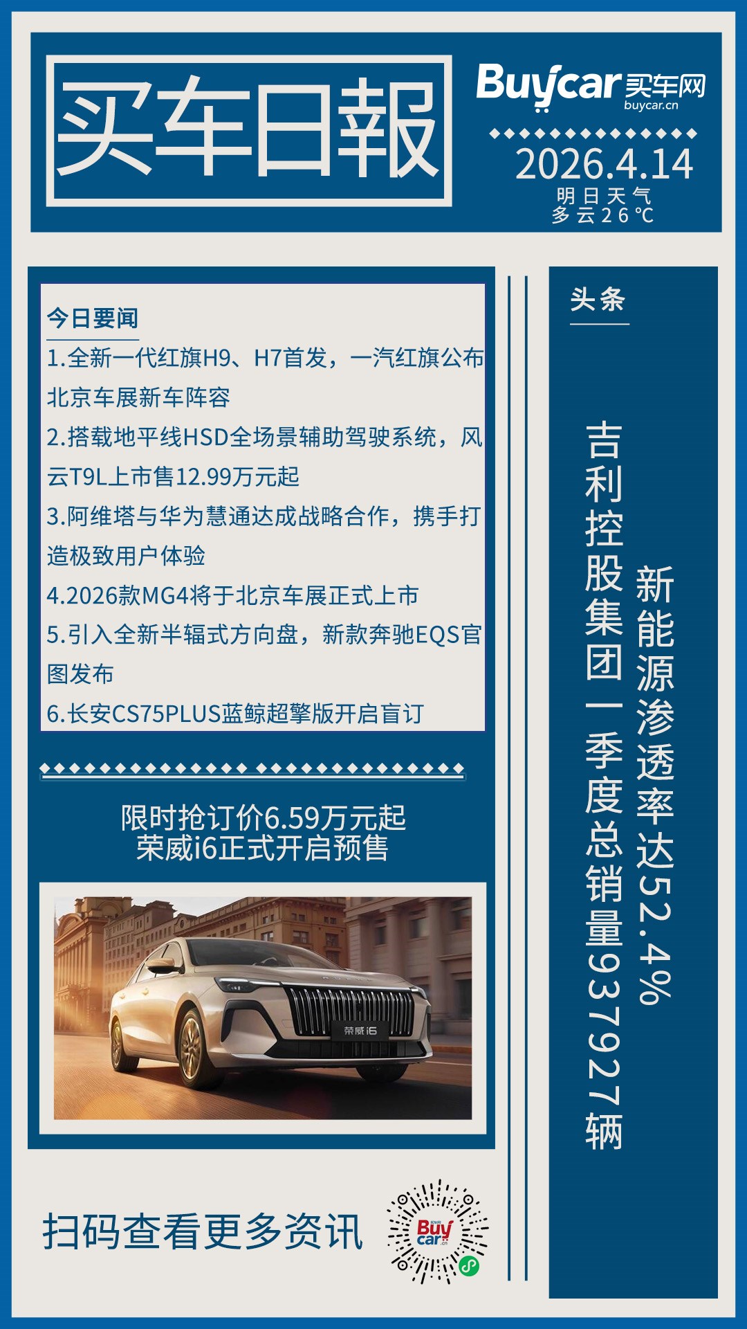 买车日报-20260414-吉利控股集团一季度总销量937927辆,新能源渗透率达52.4%